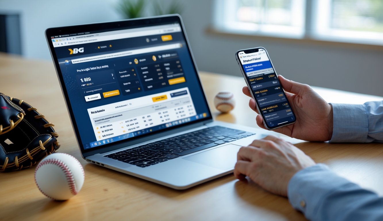 Sebuah laptop dan smartphone di atas meja kayu dengan sarung tangan dan bola baseball di sampingnya, menunjukkan aktivitas taruhan pada pertandingan baseball.