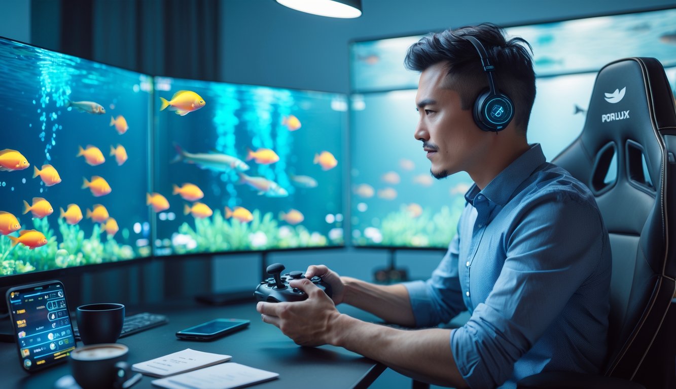 Seorang pemain dewasa fokus bermain permainan tembak ikan di depan layar komputer dengan suasana berwarna biru dan tema bawah laut.