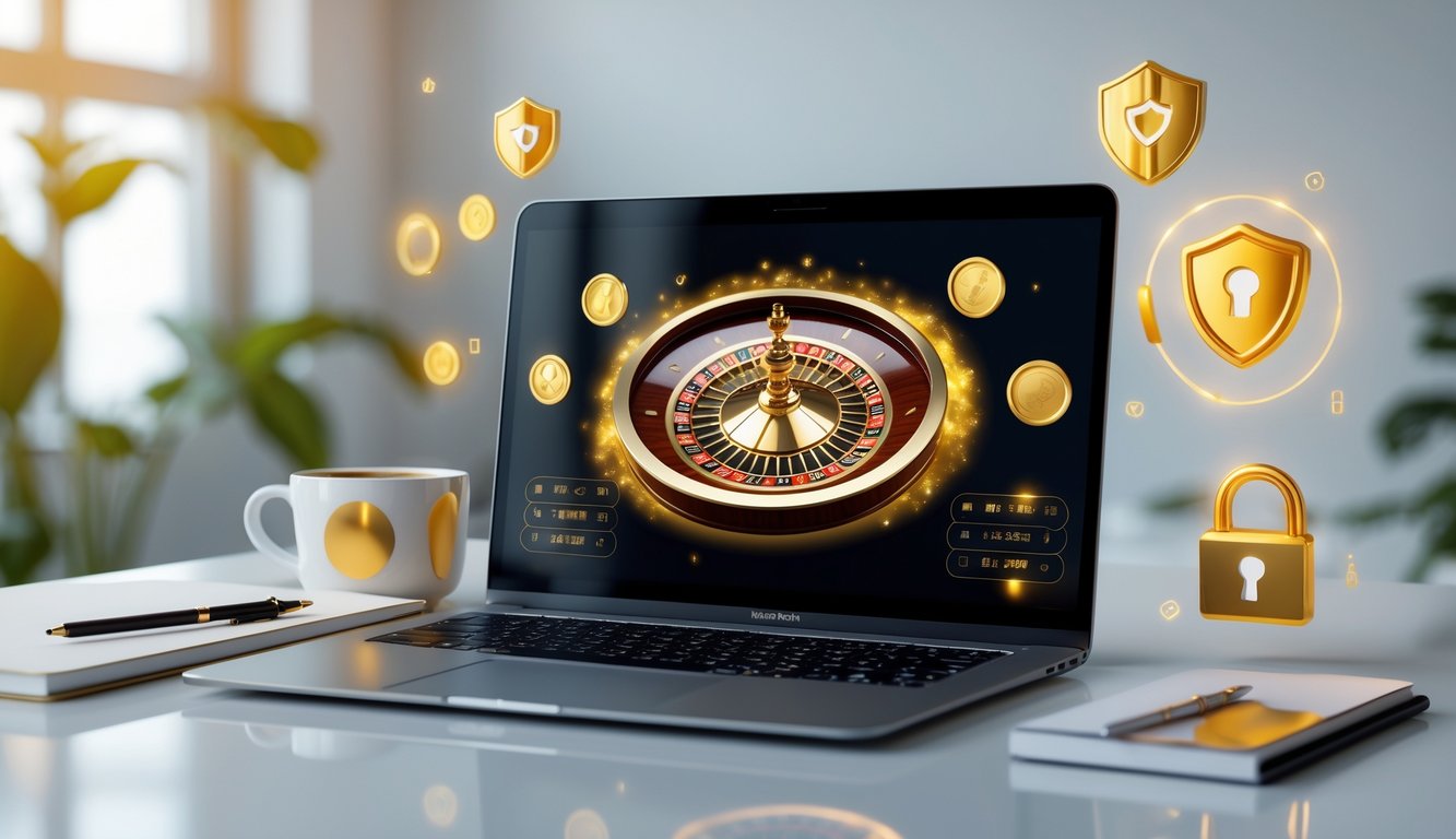 Sebuah laptop modern menampilkan roda roulette emas digital, dikelilingi oleh simbol keamanan dan meja kerja minimalis dengan kopi dan buku catatan.