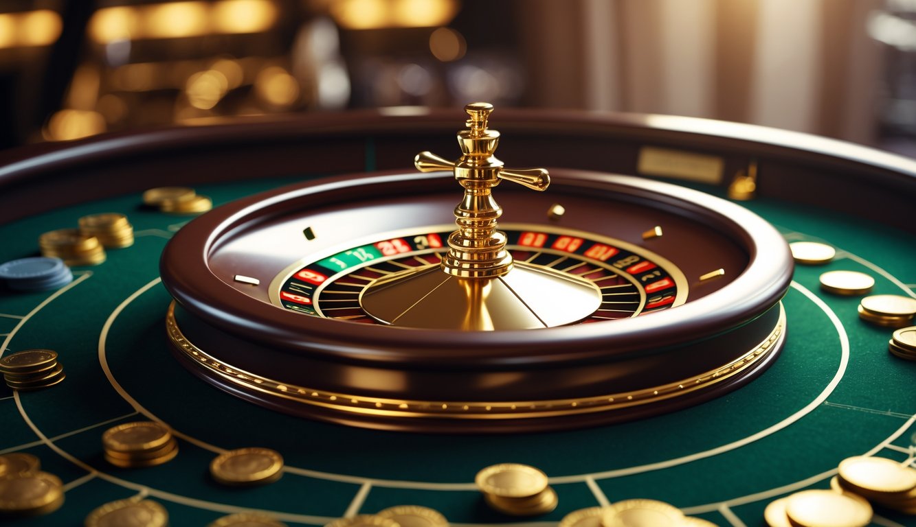 Roda roulette emas berkilau di atas meja hijau dengan tumpukan chip di kasino mewah.