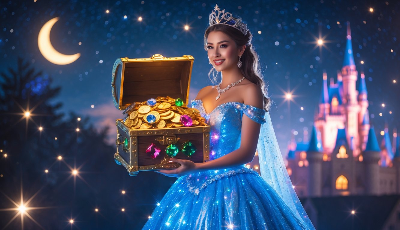 Seorang putri berdiri di bawah langit berbintang dengan harta karun yang bersinar di tangannya, di depan kastil yang bercahaya.